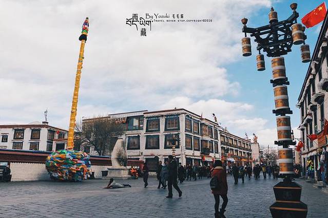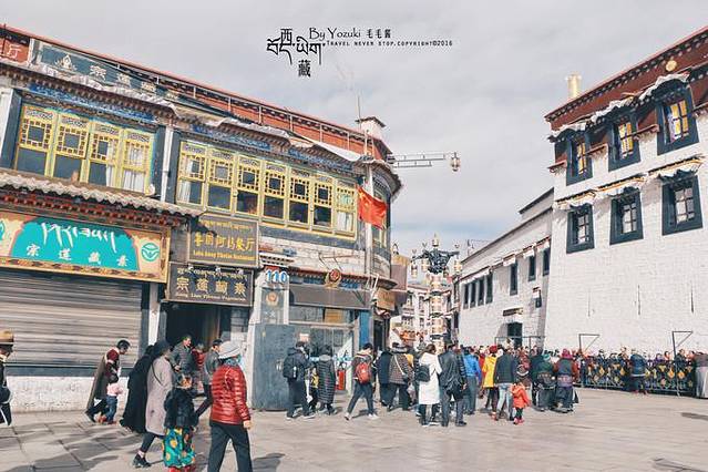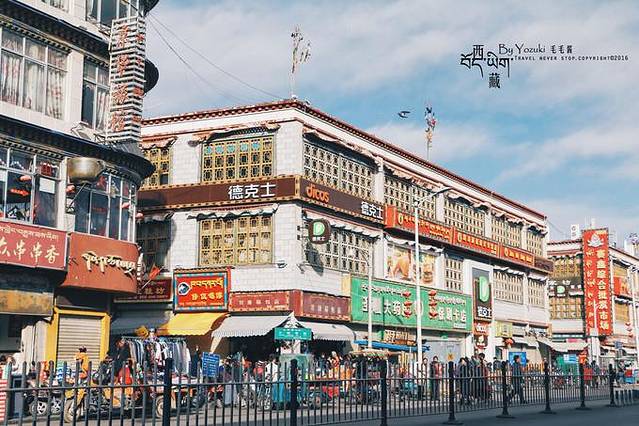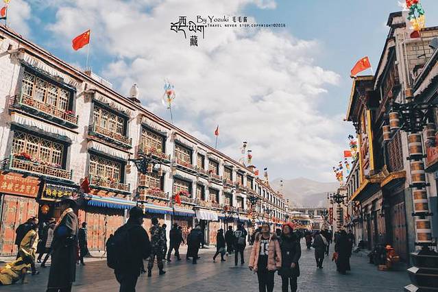拉萨市区建设的挺成熟,酒店、超市、医院都有,马路也是宽敞又干净。在小巷子里穿梭很有味道,民居有些陈旧,一砖一瓦都看得清,窗户四四方方,窗棂上的经幡在风中飘动,在蓝天下很美妙。偶尔会有几个藏族小孩嬉闹着追赶,天真无邪的脸庞泛着放学后的喜悦。似乎每条小路都能通往拉萨市中心的大昭寺,不愧是市民朝拜的首选之地。