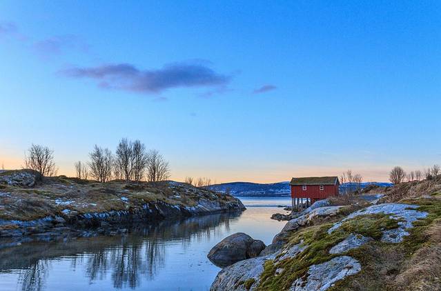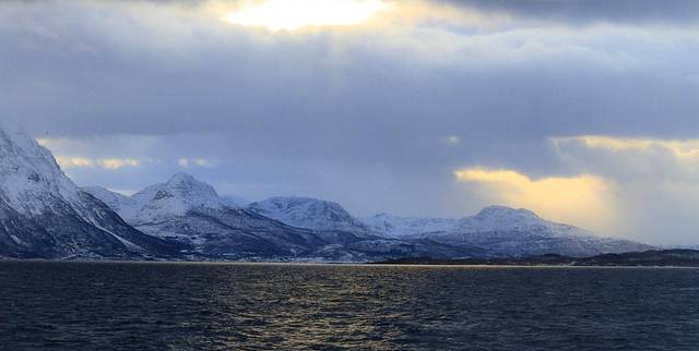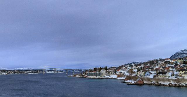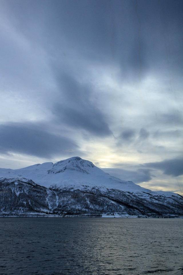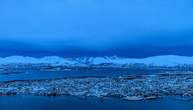 抓紧日落时分来看看特罗姆瑟全景,这个城市的主体在岛屿上,而这会儿我们在大陆上,向导向外海指去,在那里可以看到鲸鱼。一片蓝色里,仿佛可以听见鲸鱼的歌唱。