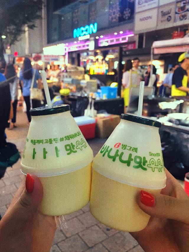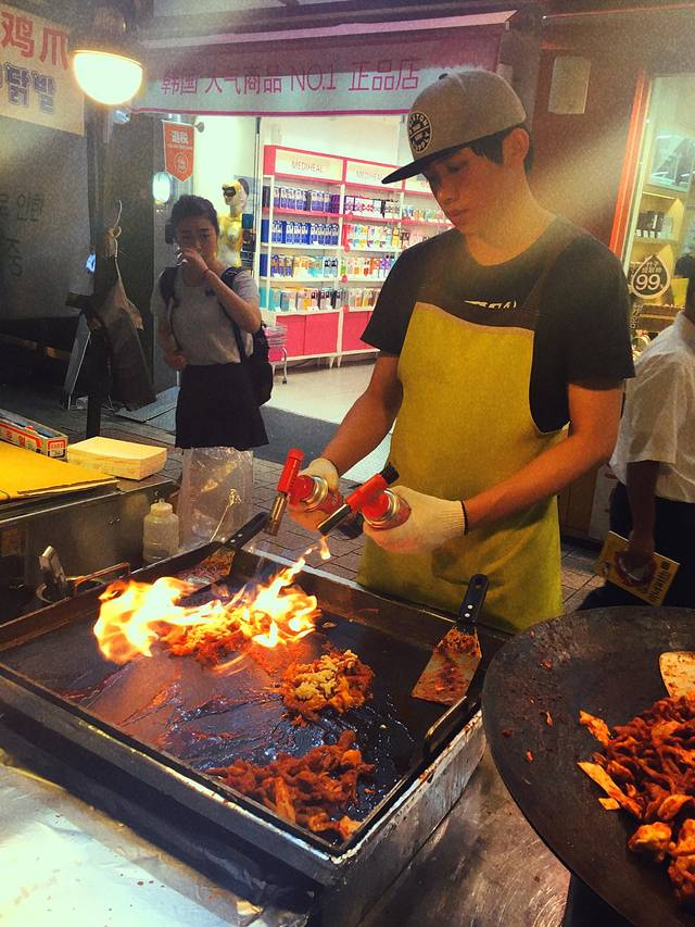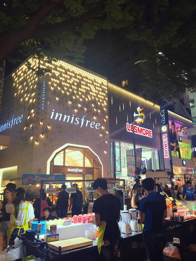 从明洞的乐天逛完往出走就是明洞的街了,两边都是各种牌子的化妆品,小吃摊,晚上人依旧很多,我俩基本是看到好吃的就买了,没吃晚饭,就吃小吃也够了