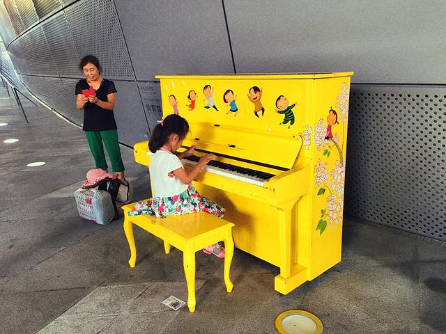 广场有一台钢琴让游客弹着玩,小姑娘这在上面弹琴练习
