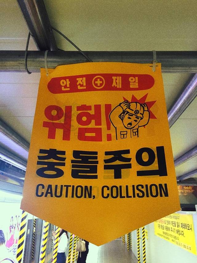 地铁里在装修,有好多铁支架,上面挂了好多防撞头标志,好可爱!