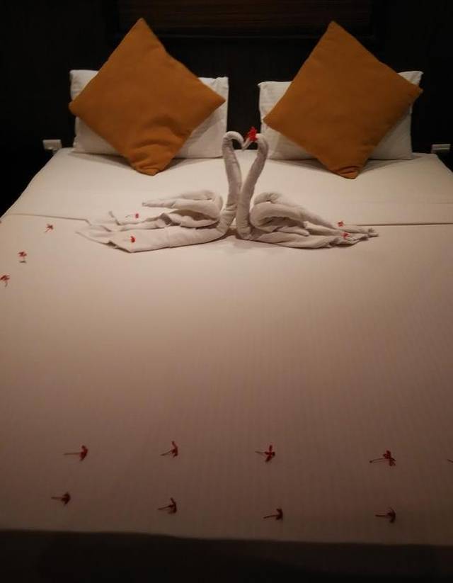 酒店是很漂亮的。进门有4个小池子,莲花红鱼,夜间灯光影绰,最是好看。里院有个大泳池,只是傍晚就关闭了,不过仅观赏也很棒!进门时会送一人一杯饮料,挺好喝解暑的。 房间面朝tiss湖,湖心的树上仿佛开满了白花,细细看去才发现是水鸟,很惊喜。 酒店给我们准备了蜜月房,花瓣撒床还有毛巾鹅。最可爱的是鹅是一对,母的那只头上有花。感觉很细心,都不舍得睡上去。 房间浴室都挺大,很干净。but!最大的缺点是有虫子。一落日千万不能开窗。玻璃上帖着一层虫子,会扭的白飞虫,各种在交配。吓人!而且即使不开,房内不知道哪里来了很多小黑虫,因为酒店的吊灯在床的正上方,虫子都躲在床上,不仔细看着像霉点。介意的亲们慎选!不过我老公聪明😊想了个办法,睡觉厕所灯和门都开着,虫子就会飞走了。 总体还算不错