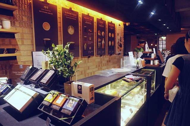左边的巧克力蛋糕更像是口感较硬的布朗宁,中间的一块巧克力很好吃。右边这个真的太好吃了!因为点单的时候我是拿大众点评的图点的所以这是什么我完全不知道!服务员端上来的时候我潜意识觉得是咖啡就端起来喝了,没想到除了沾了一嘴奶油外啥都没喝到!其实人家是柚子冰沙阿!非常好吃!强烈推荐!一共12000韩元