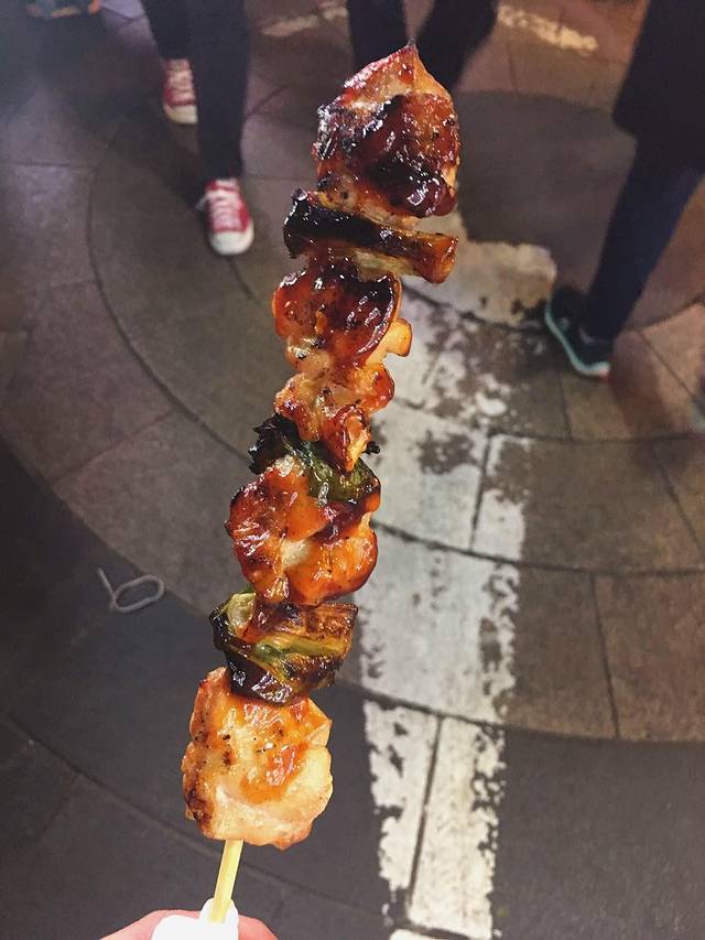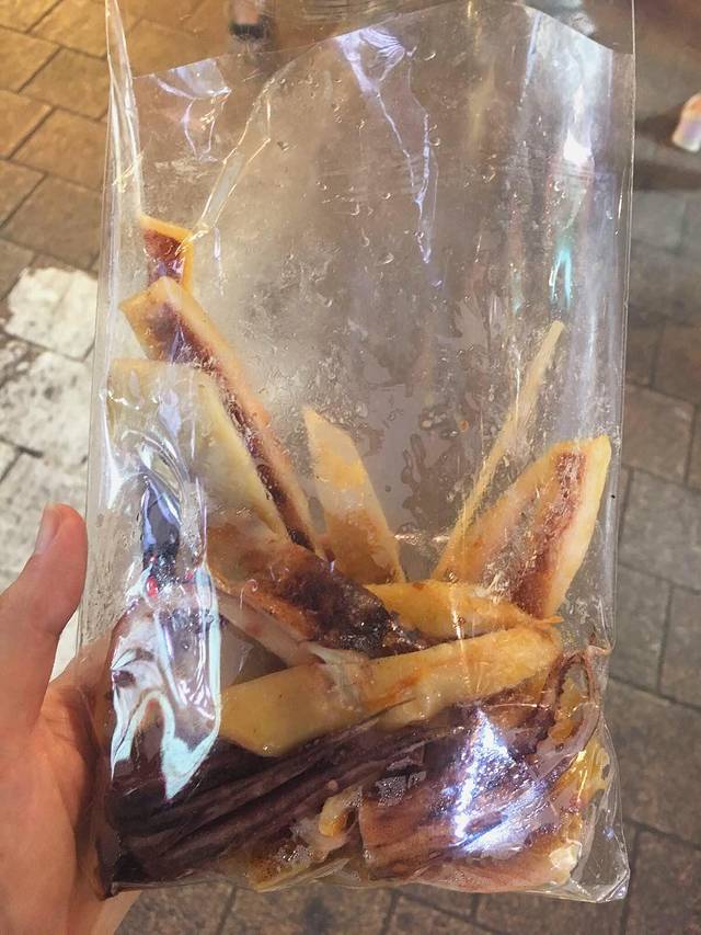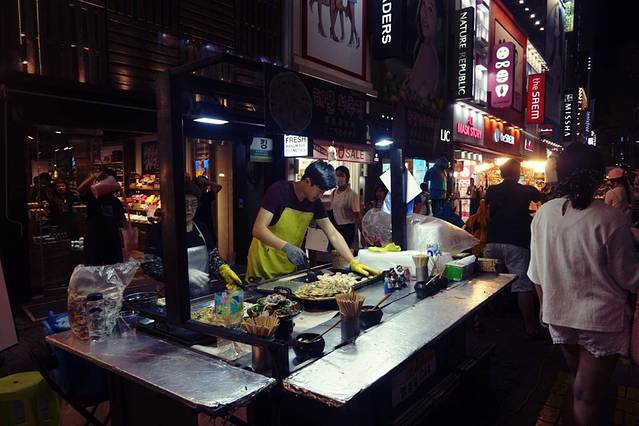 大概从晚上六七点钟开始明洞中央街就开手机陆陆续续摆出小吃摊了。小吃的种类有很多,比如网上很红的鸡蛋糕、鸡肉串、炸酱面、烤鱿鱼等等~如果一直在明洞逛到晚上或者晚归经过的话可以去感受一下!但是都不算很实惠,旅游景点的东西那价格你懂的!