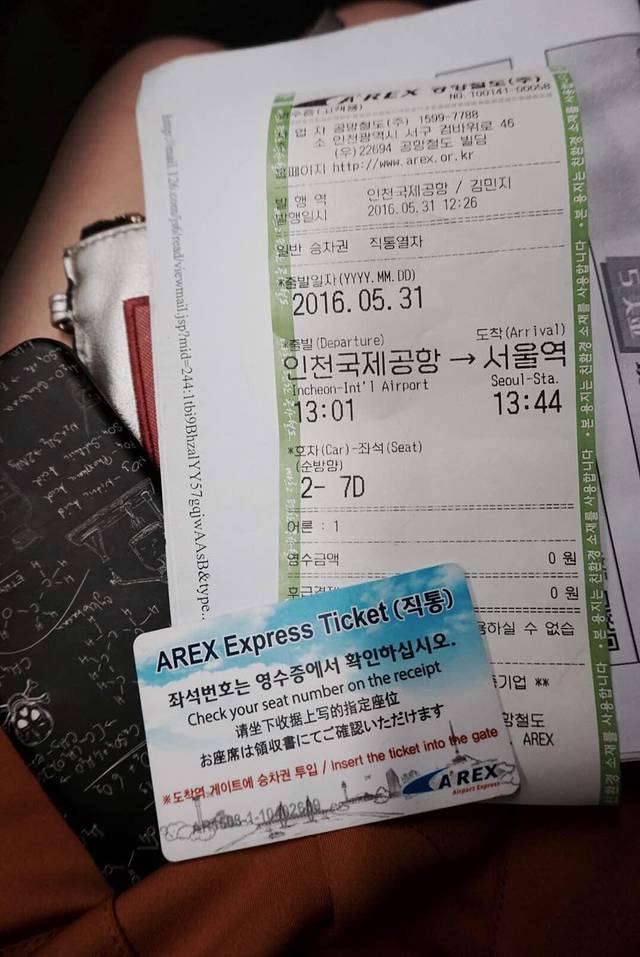 完全没有想到短短1h40mins的航程里居然还有飞机餐!我已经是戴着蒸汽眼罩昏睡过去了,那种被饭菜香味叫醒的感觉真是太美妙了~韩亚航空的空姐真的很漂亮!纵然这个航空公司出过的事故也不少但丝毫不影响这次在我心里留下的好印象!到了以后沿路都有指示,不清楚跟着人流走就好了~路上都有标示指示去哪里搭乘Arex,B1有购买车票和兑换网上购票的柜台,拿到票以后再下一层就是站台啦~