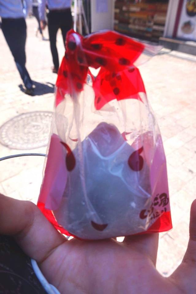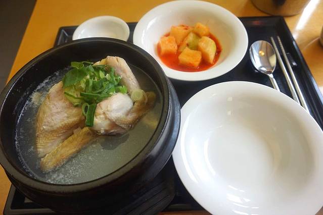 第一天的晚饭应该是最正常的一餐了,在眼花缭乱的美食中选择了味加本的参鸡汤~看到有人网上说太咸了可是我觉得正好,把鸡肉沾盐和胡椒真的是非常好吃呢!鸡里面包的是糯米,糯米里有枣、栗子和一根人参!于是马上就发照片给老爸老妈看了,被吐槽说在国外什么都是好吃的…可是真的很好吃啊!13000韩元一份~