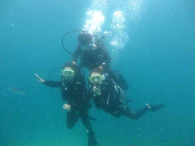 我们是两两一组一个教练,我先被教练带下水了,刚开始因为水压耳朵还很疼,教练帮我捏住鼻子我呼了几次气就好了,问完我OK不?我说OK,我就被他顺利送到了海底,我一个人静静地坐在海底等着我的小伙伴下来~~