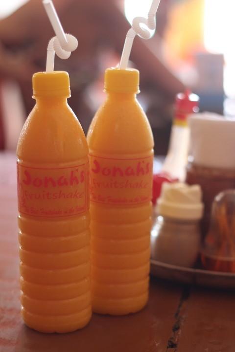 星期五海滩上著名的芒果冰沙:Jonah's Fruit Shake & Snack Bar。这家的芒果冰沙是装在如图所示的矿泉水瓶子里,口味微酸,我个人比较爱吃甜的,不过微酸说明没有放糖更纯。在炎热的沙滩上,去Jonah‘s喝一杯冰沙,简直不能再棒了!反正这家店是导游强烈推荐的,就在星期五海滩上,对面就是圣母礁岩,除了芒果冰沙,水果拼盘也不错哦~~~~