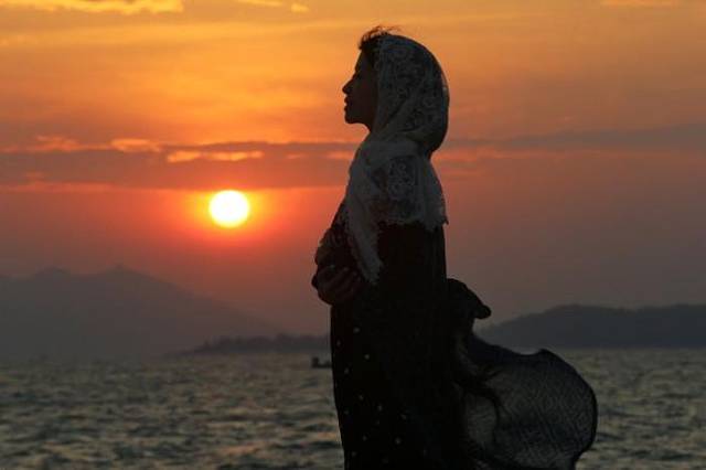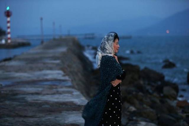 把白色蕾丝围巾胡乱当作头巾,走进西岛寒潮的早晨。