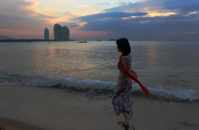 出岛寻美食,经过三亚湾的海,海对面就是我们住的凤凰岛,穿过人群走到海滩,突然之间感觉到三亚最美的黄昏。