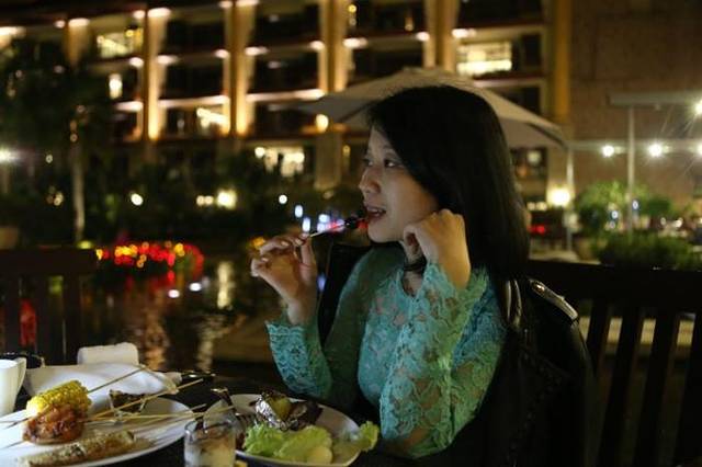 黄昏的大堂吧,喝一杯和酒红露背小礼服默契颜色的三亚玛丽吧。