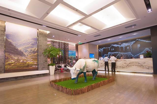 大堂中间是与跨国公众艺术活动Cowde合作的艺术创作:牛身涂鸦,以牛为载体,结合当地特有的文化底蕴,并与城市地标景观进行视觉艺术上的完美结合,向世界展示城市文脉,凸显城市个性。