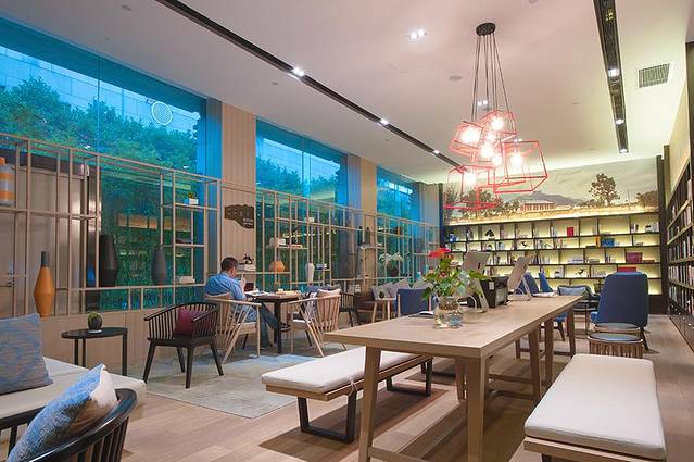 亚朵酒店的人文切入点是阅读和摄影,所以当你进入酒店内部,如果不是因为有接待大堂,可能你会误以为走错了地方。每个亚朵都有一个名为“竹居”的图书空间,与上海三联书店合作,每间“竹居”藏书数千册,无论是住店客人还是周边邻居,都可以实地免费阅读,也可以无抵押异地归还。这是一个24小时免费的阅读空间,还提供免费茶水、免费使用电脑上网以及打印文件等服务。