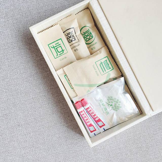 牙刷、梳子和浴帽等整齐摆放在盒子里,每个细节都做的很到位。