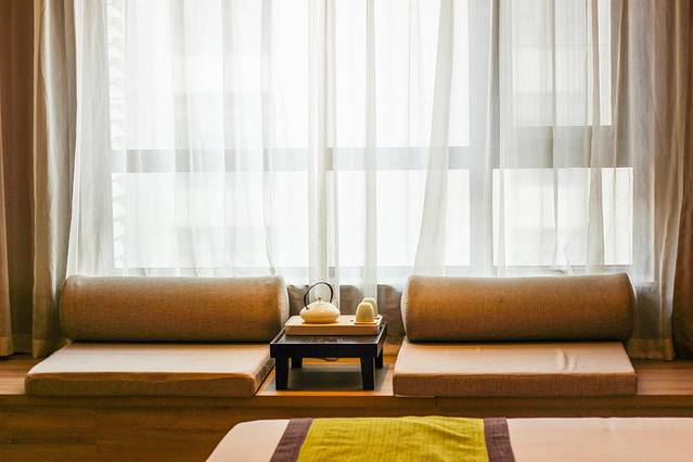 窗户上挂着白色纱帘,有朦胧光线透过,素雅的茶具,摆放在卧榻旁,坐在这里,说话也好,发呆也好,过得浮生半日清闲。