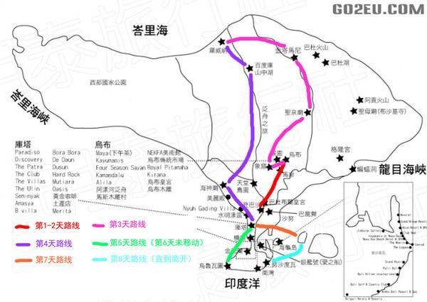 3.制定行程,时间充裕的话,建议从北到南都玩一圈,如果时间有限的话,就要在景点中取舍一番,位于中心的乌布是一定要去的,通常是在一南一北之间做一个取舍,南部是巴厘岛酒店和沙滩最棒的地区,金巴兰的烤肉,努沙杜瓦的沙滩,蓝梦岛的浮潜,都不容错过;而最北部的罗威纳Lovina又是巴厘岛最有意思的“出航看海豚”的唯一地点,南北都难以割舍啊,可是横亘在中间的是一座巨大的火山(当然是死火山啦,不用担心)