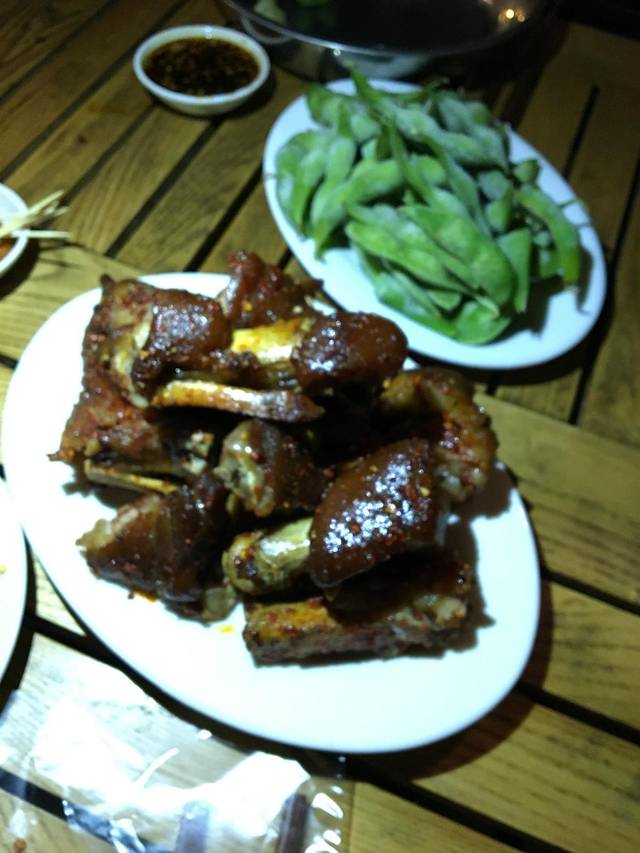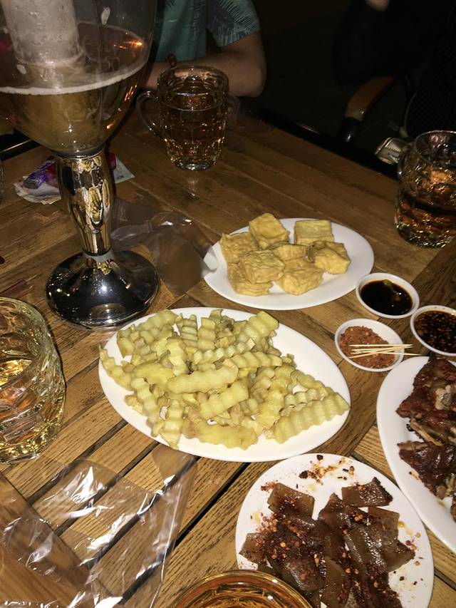 做完足疗我们就赶往这个地方--沙滩茶室,本来我们是想坐在外面的,那里有人在唱歌,歌声还很动听,但是人太多了,座位都满了,所以我们只能坐在里面了。不过还好,里面也很清凉,人精神了不少,大概一眼望过去来这里玩的外地人还是多的,很热闹。我们点了两份大份的扎啤,分别是葡萄味的和菠萝味的,还点了一份炸土豆、一份凉拌黄瓜、一份凉拌鱿鱼、一份烤猪皮、一份石屏豆腐、一份烤猪蹄、一份冰毛豆。点的时候没有发现多少,上来的时候感觉还是很多,但是女生嘛肯定是可以扫光的。这里的凉拌鱿鱼我很喜欢吃有点泰味的那种酸爽,辣椒也很给力,这酸爽,棒棒哒。喝着扎啤,吃着好吃的,聊聊这些年大家的变化,氛围很好。