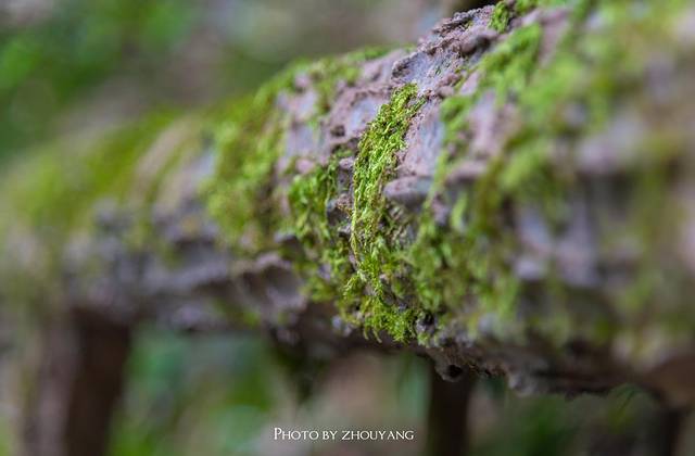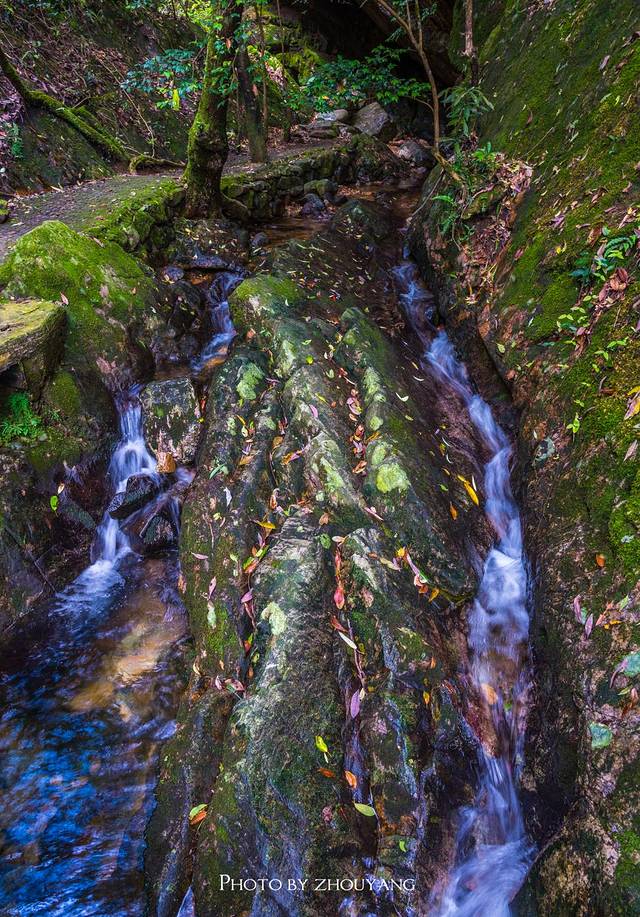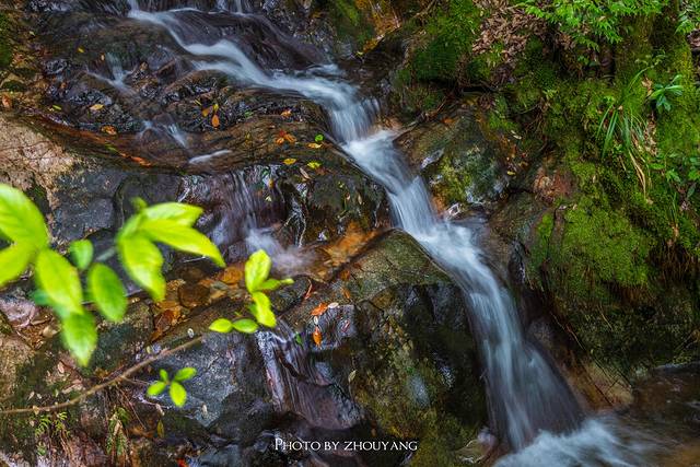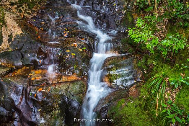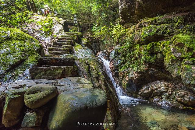 在丛林之中,石涧中的飞瀑冲击着石块,溅起水花,湿润了山涧,也滋润了苔藓,鲜绿的青苔装饰着山石、台阶、扶手……让绿色充满了整个森林。