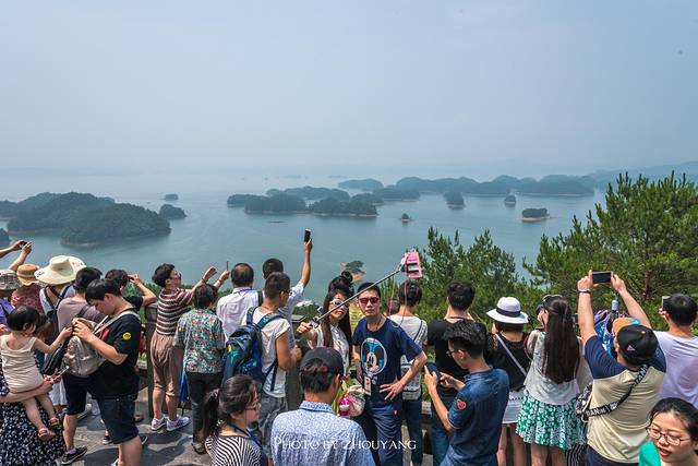 排队等到了一个不错的机位,迅速按下快门记录几张还算说得过去的图片。由于距离较远,朦胧的雾气,让拍摄的清晰度也受到了一定损伤,但总得来说,还不错。俯瞰下的千岛湖,小岛茂密葱郁,湖景清新秀丽,来来往往的游船在静谧的湖面上划出一道道美丽的弧线,这样的视觉体验也是最能体会千岛湖千岛魅力的,所以就有了这句“不上梅峰观群岛,不识千岛真面目”。