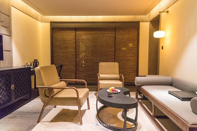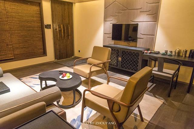 每一栋建筑都是1-2套客房,我入住的是一座两层别墅的一层G房型,穿个一个精致的庭院,走进我的房间,宽阔的客厅,古色古香的家具摆设,有如回到家中的感觉,如果有三两友人聊天打牌那是很惬意的事。拉起竹帘,推开木窗,荷叶的清香随风而入,质朴而又惬意。