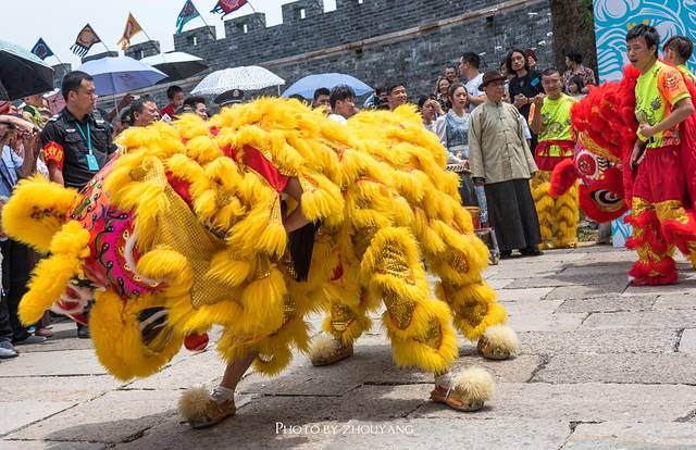 古城外也搭起了戏台供舞狮表演,再加上端午假期,古城内到处是前来参观的游人。