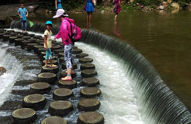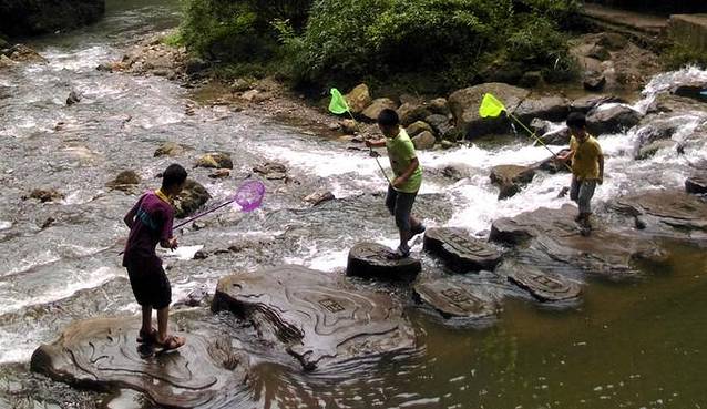 沿途都是各种沿着小溪修建的栈道,一点儿也不累。每走一步就是风景 。小溪水并不深,沿途看见好多小孩子拿着捕鱼网抓鱼,还有很多在河里搬螃蟹的。