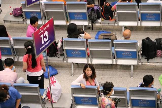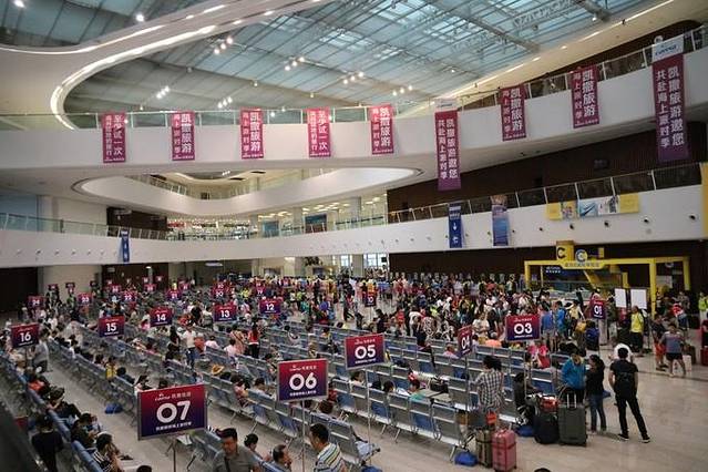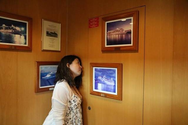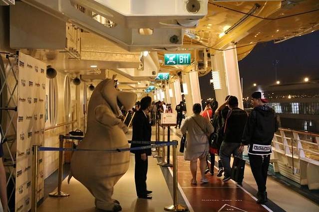 这就是候船大厅了。在这里等着预先通知的时间,一般都是有导游团的,我们这次是凯撒包团。都说排队上船的时间要很久,其实也还好啦,因为毕竟都是分批登船的,所以不会等候太多。中间要进行出境的一个过关,然后经过一段回廊就可以看到船啦。我们本来应该是中午登船,结果延迟到了晚上,我也很气愤(这趟船各种不靠谱,后来经过协商退了我200元最为迟到的补偿。船方补偿了一点代金券作为改行程的补偿,次年有效,基本没啥意义,都是写着你的人名的,还不能送人)。