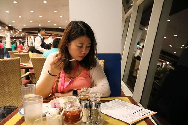 因为有点饿了,所以马上上楼吃饭。。是自助餐厅,餐饮真的不像之前想象的好。后来才知道, 之前豪华邮轮费用也高,走的是高端路线,光水果啥的都是火龙果啊猕猴桃这种档次,但是后来为了推广,价格下来了,只能从餐饮这种地方减,总体来说不算好也不算坏吧。