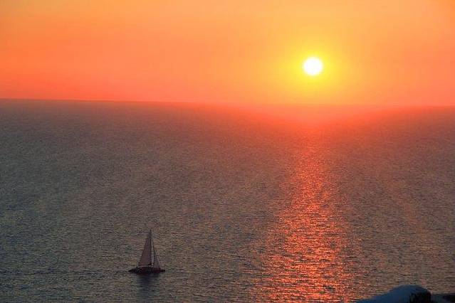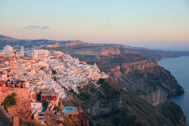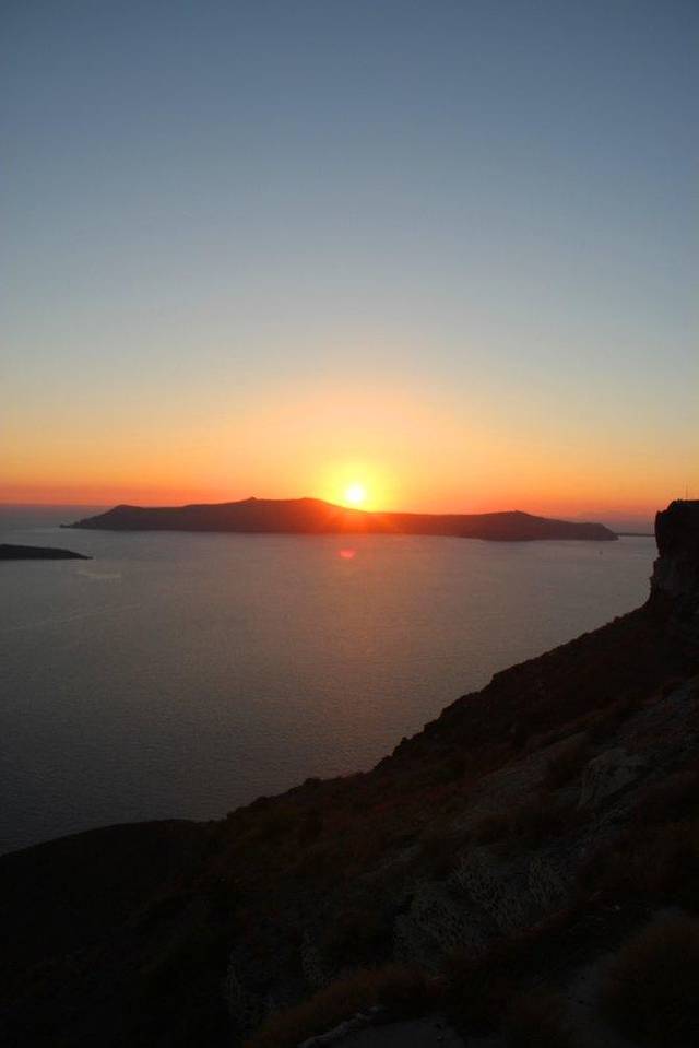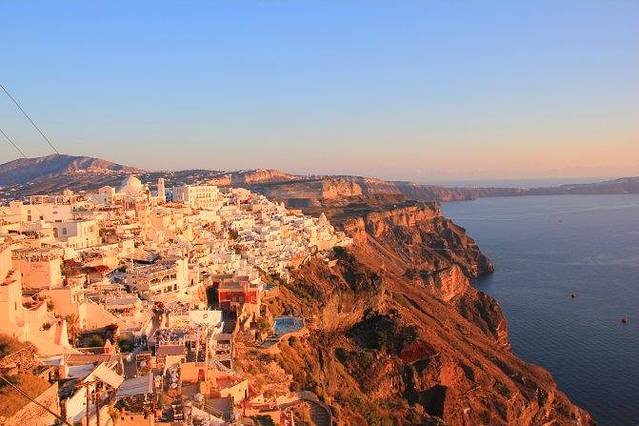 圣岛的景色真的美到无与伦比,太阳渐渐落入火山岛后,暮光洒落在圣岛悬崖上的fira镇上,非常壮观。