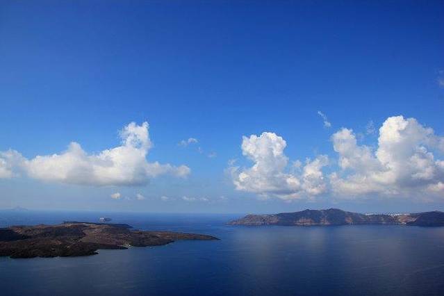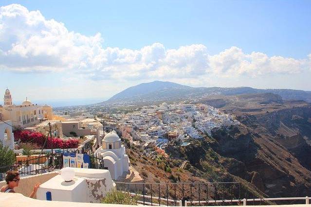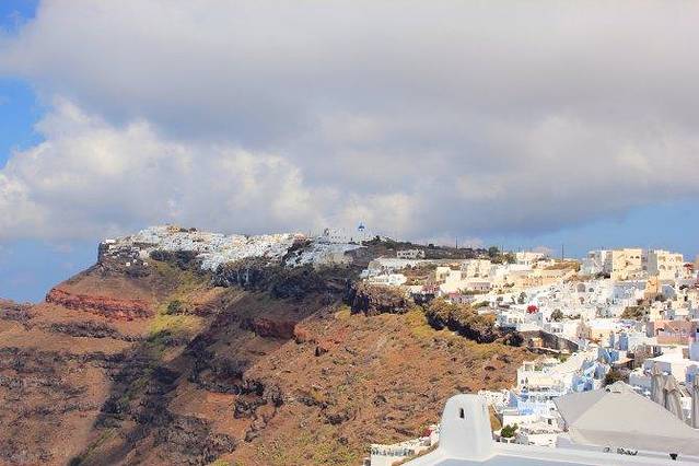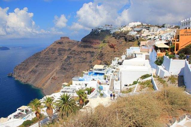 更加壮丽的悬崖爱琴海景色,从Fira镇出发,向上坡方向步行20-30分钟即到(经过Firostefani)。