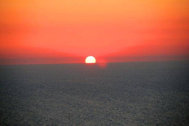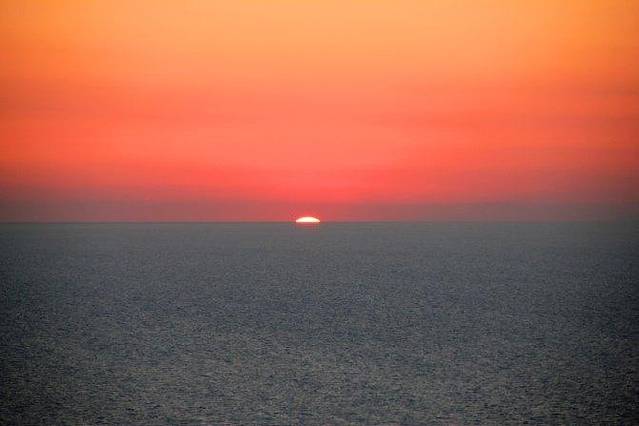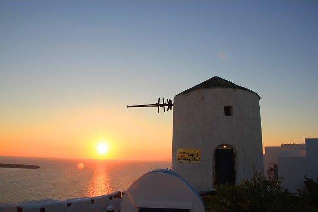 吃完饭回酒店稍事休息,准备出发去oia看世界上最美的落日。开车大概20分钟左右,到了oia小镇。日落的时间是晚上七点半左右,但六点多在最好的观景台上就有大量的游客在占位子等日落了。我们在镇上漫无目的的走着,在一处狭窄的小路上坐下来等日落。Oia的日落据说是世界上最美的日落,当太阳开始收敛刺眼的光芒,慢慢的隐没在海平面,那一刻真的是非常浪漫美丽的。