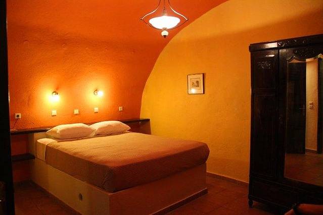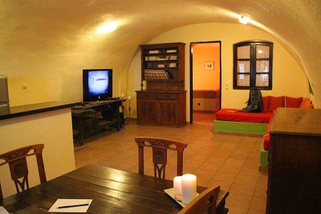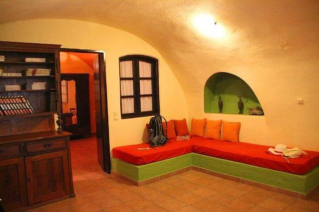 洞穴房是圣托里尼的传统房间,像住在洞穴里面,很有特点。房间的客厅有长沙发、书架、吧台、冰箱、还有大电视和音响。