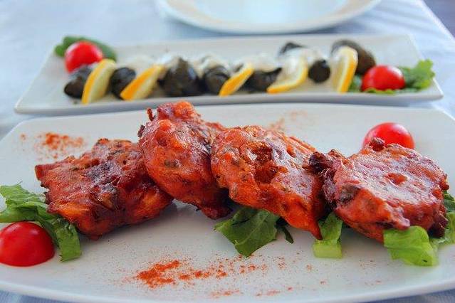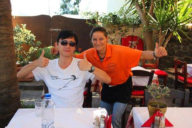 一路走到最上面的Imerovigli再走回来,已经是中午一点钟。在蓝顶教堂下面的Mama’s Thira用午餐。点了葡萄叶卷饭,炸番茄饼和烤牛肉,再来一杯Frappy,美美的享用大餐。这一餐一共是34欧。