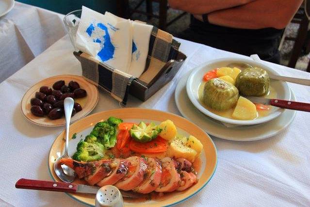 六点钟去fira镇里最有名的nikolas吃晚餐。这家店不大但是很有名,是吃传统希腊美食的地方,晚上稍晚一些门口就会排队。