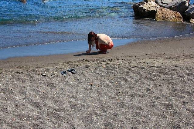 第四站,Perissa黑石滩。岛上的黑石滩有两处,还有一处叫kamari,但据说perissa的海滩更干净漂亮,人也更少。这儿的沙子都是黑色的。