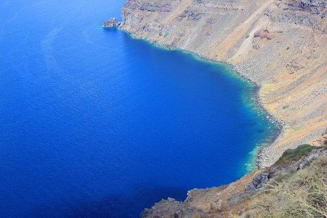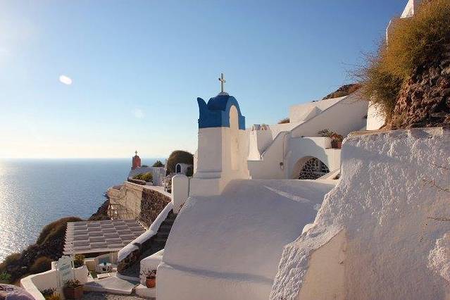 悬崖步行道的中间小镇,这里有因国家地理杂志封面而闻名的蓝顶教堂,因大家照片而闻名的“破船”。从Fira镇出发,向上坡方向步行10分钟即到。也可从Fira汽车总站乘前往Oia方向的公交车,Firostefani站下车。票价:1.6欧