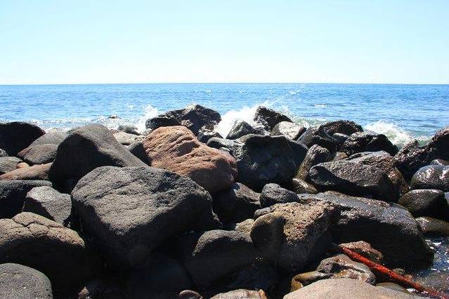 红石滩,周边的岩石是褐红色,要翻过岩石才能下到水边的石滩。