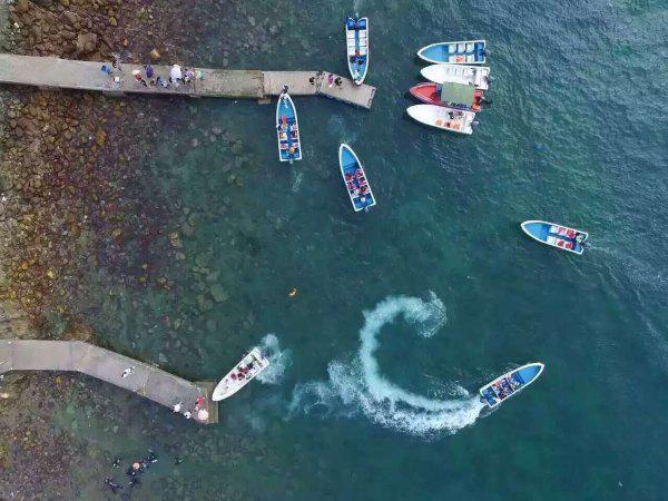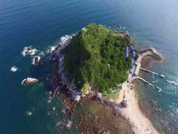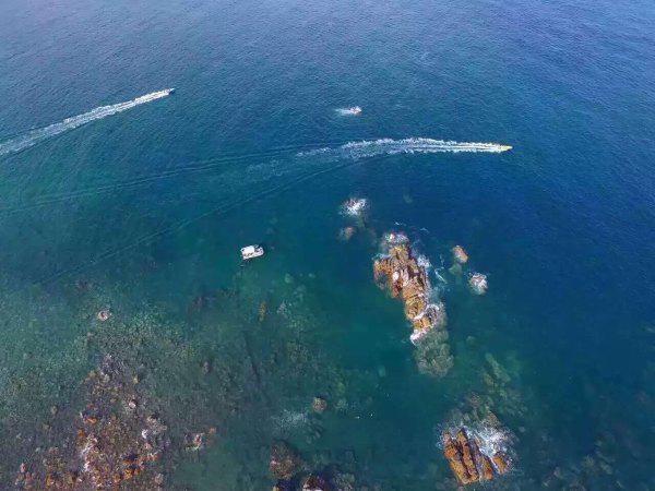 飞艇慢慢向岛上驶去。还没到岛上,就能发现岛上的水非常清澈。情人岛上是礁石滩,水质清澈,还能看到藏在石头缝里的海胆。西涌的海胆很有名,是用来做端午海胆粽子的原料,新鲜而美味。如果你不喜欢多刺的海胆,也可以搬动小石头,抓抓游来游去的小鱼,摸摸小海螺。
