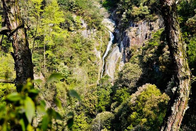 龙头桥下车,一抬头就看到山崖上垂挂着一条大落差的瀑布,心情大好。
