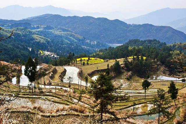 1、五月中旬,插秧的时候,梯田蓄水如镜。