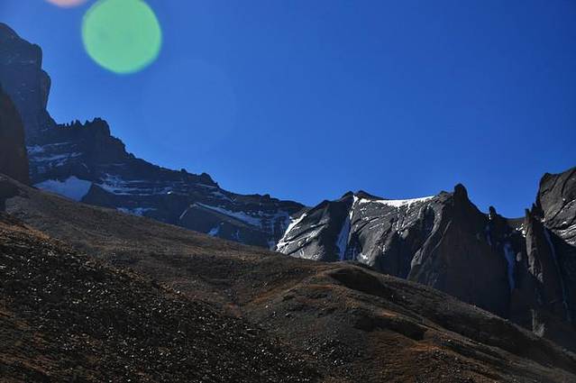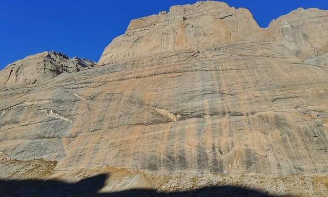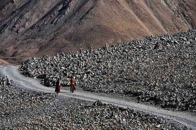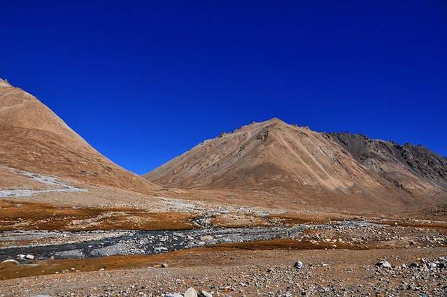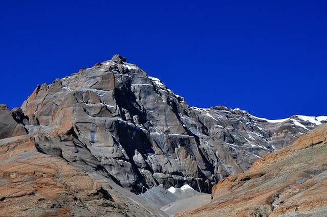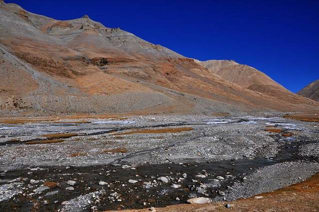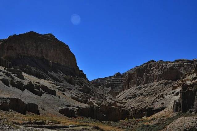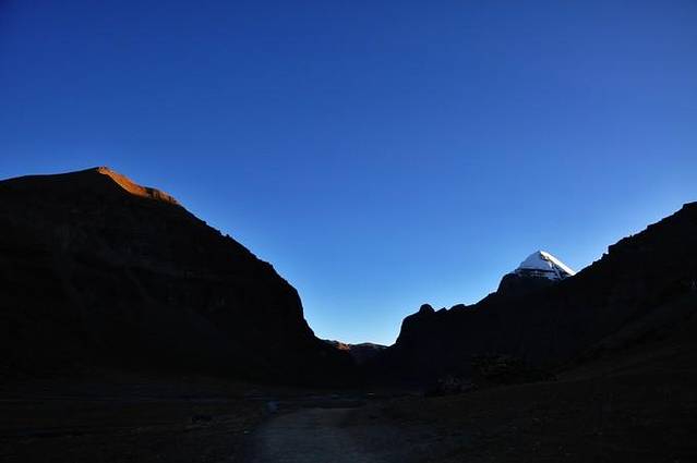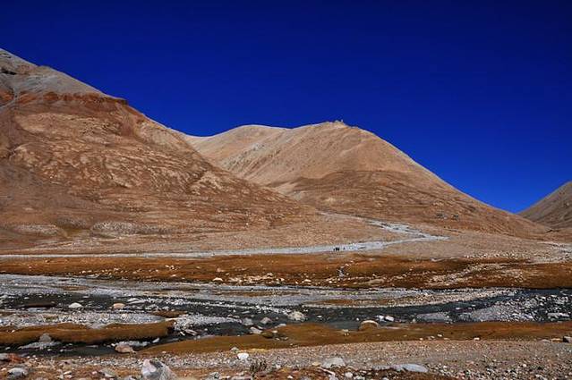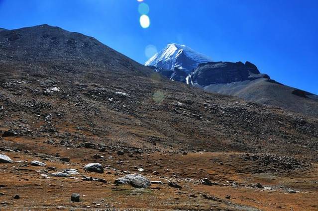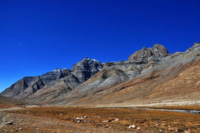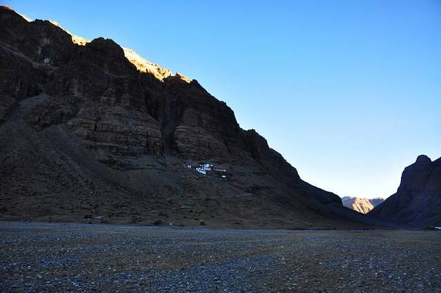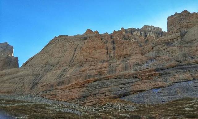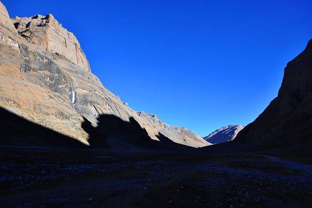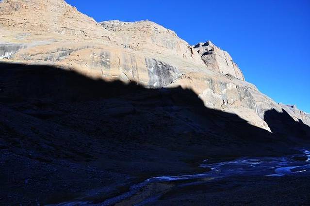 从这里能够看到冈仁波齐极具震撼力的西壁,那三角形的冰壁仿佛端坐在莲花宝座上的佛像。转山道在小桥分作两条,分别沿着Lhachu河的东西两岸。两条道都通向芷热寺,大约还有3.5小时的路程。西岸的路在快到的时候必须脱鞋涉水,沿东岸的路则要稍微远一点。两条路都不陡,但海拔一直在缓缓上升。此时东侧的岩壁挡住了视线,看不到神山。