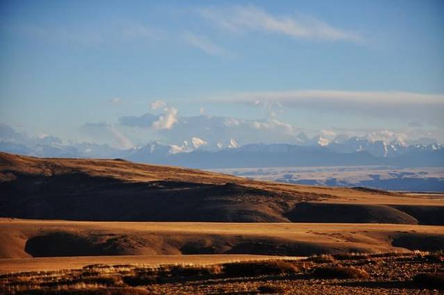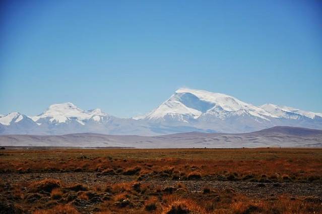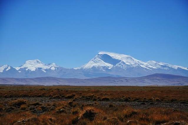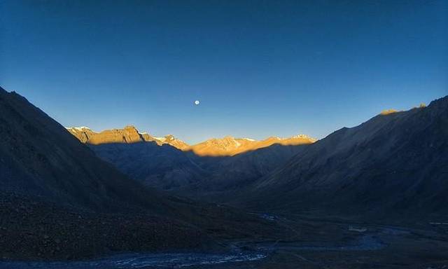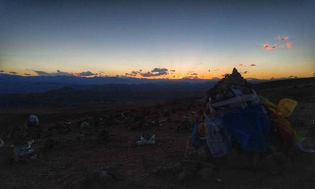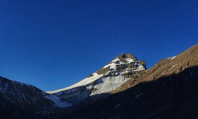 从塔尔钦出发之后,过了经幡广场,向西顺时针方向都是佛教徒的转山路,而向东逆时针方向则是本教徒的转山路。第一天大部分的山路平缓,坡度小,南方隔着八葛平原和鬼狐,喜马拉雅山脉西侧的诸峰一字排开,黎明的曙光一点点将山峰染成黄色。