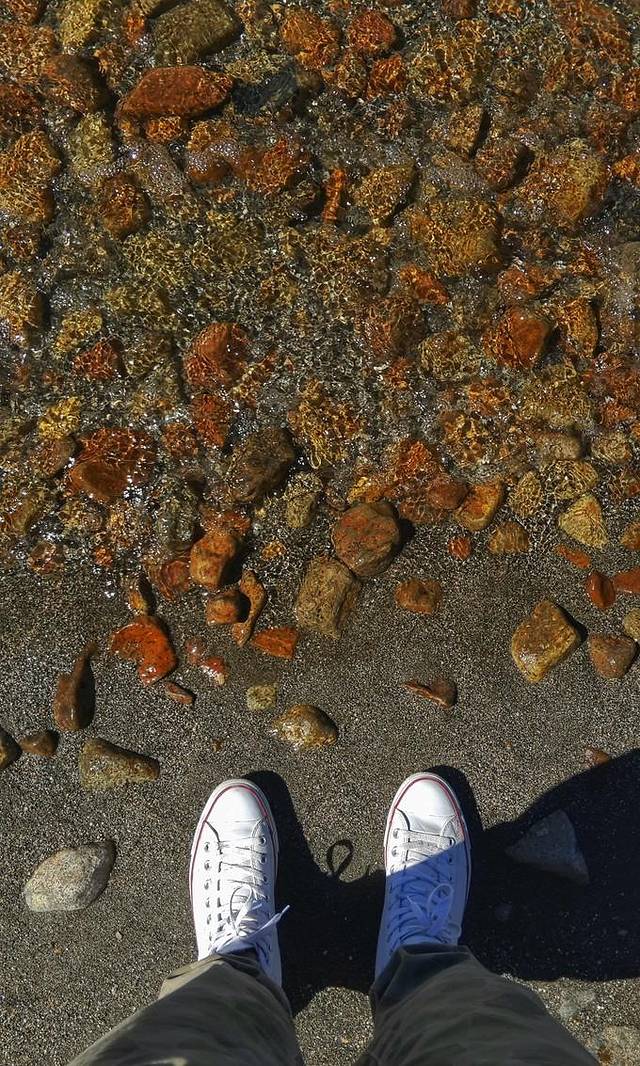 据说鬼湖是无风三尺浪,湖边暗红色的小山,颜色迷离,湖里还有一个小岛,也是暗红色的。行至湖边,耳边阵阵波浪声,卵石滩象一条白亮亮的银带,镶在湖边。