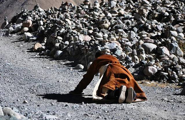 笃信佛教的藏族人坚信,朝圣能忏悔洗尽前世今生的罪孽,并增添无穷的功德,并最终脱离六道轮回,荣登西方极乐世界。因此,总是有数不尽的藏族人,以独有的磕长头的方式俯仰于神山圣湖的天地之间,向圣地跋涉。没有血肉之躯,便无朝圣之举,没有风尘仆仆,便无朝圣之途,不历经千辛万苦并跨越真正的时空,就不会有心灵的虔诚。朝圣对于一个虔诚的信徒而言,是可以以一生的时间去认真对待的神圣之举。甚至可以这样说:超出“苦行”意义之上的朝圣之旅是将个体生命之旅推向极致的唯一途径。