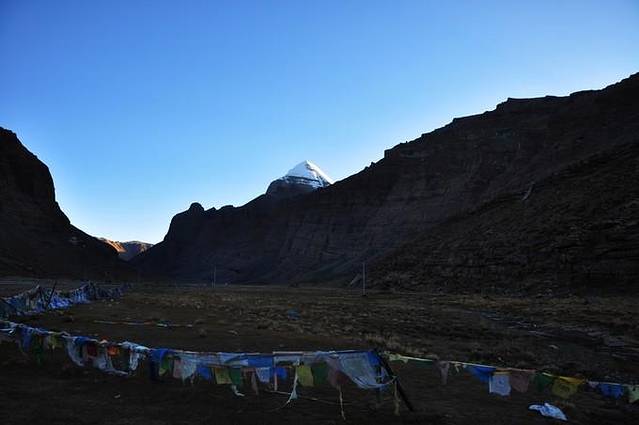 第一次转山,为了给身体一个适应,所以我们天不亮就出发了,因为我们要徒步20公里意外才有住宿的地方,所以必须留出充裕的时间才能走到休息的地方。 向西走不出多远,然后向山坡脚靠近就能看到转山的小路了,我们前方不远处就有几个藏族人已经在转山了。缓缓地爬高差不多一个小时之后就到了所谓的经幡广场,上面的玛尼堆上挂满了五颜六色的经幡,这里已经可以看见神山的西侧了。由此下坡,小道折向北进入拉曲峡谷(LhachuValley)。之后徒步1个小时左右就到达两腿佛塔了(ChoSenKang-nyi),这是神山的标志性建筑之一。从它的两条腿之间穿过会得到神的保佑,而有罪的人则无法通过。