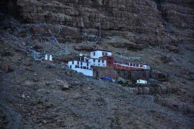 佛塔的东面几百米处有一棵巨大的经幡柱,经幡柱每年4月15日斋会定期更换,这是一个十分隆重的仪式。如果你计划在马年转山,一定不要错过这一天。接下来要沿小路下到谷底,两侧是耸立的红色峭壁。西侧中部的峭壁上建有悬空寺(海拔4820米),初建于13世纪。峭壁下有一条小河河,跨过河上的小桥就可以爬上这座悬空寺。寺中神坛上方的玻璃柜中有一尊珍贵的塑像叫Ch0guOpame,来自印度,据说会开口说话。