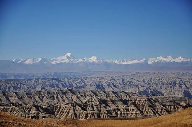 行驶在冈底斯山脉和喜马拉雅山脉之间,沿着象泉河谷,气势恢宏的土质莽林映入眼帘。扎达土林是远古时期湖泊及河床经过漫长时期的流水侵蚀而形成的独特地貌,遍布整个扎达县城,方圆数百平方公里,这种地貌在地质学上被称作河湖相。在朝霞和夕阳的映照下,山纹明暗有致,色调金黄,河边的土林及附近废圮的佛塔在暮色之中神秘而庄重。