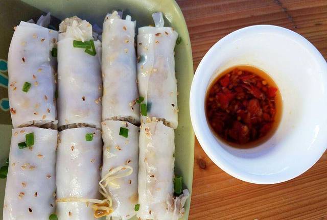 猪肠碌端上来时我还小小惊讶了一把,和我想象中的不太一样,但是看上去很普通,感觉跟肠粉差不多。热情的老板听说我们是外地来的还很热情地给我们介绍,里面的馅基本是由豆芽、炒河粉做成,以整张的河粉作皮来包裹,撒上白芝麻,有的人喜欢蘸着辣椒酱或者番茄酱来吃。作为四川人,我是无辣不欢的,问老板要了一小碟老板自制的辣椒酱,辣椒酱跟我们那边的辣不太一样,辣劲不足,香味有余。