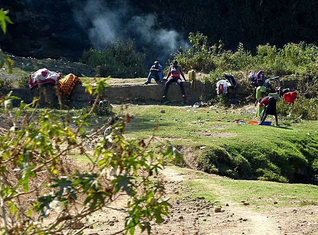 图34:7月28日,摄于纳库鲁湖至阿布戴尔国家公园途中。图为经过赤道线时,在赤道线纪念牌附近,当地人在做实验:一个圆形容器,中间有孔。在北半球时,水流出时是顺时针的;南半球时,是逆时针的;赤道线上时,垂直流下。