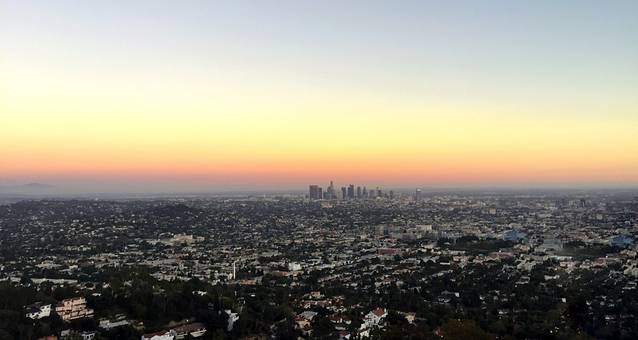 在格里菲斯天文台上,看着夕阳渐渐落入地平线,整个洛杉矶城都笼罩在一层橙黄的光晕中。